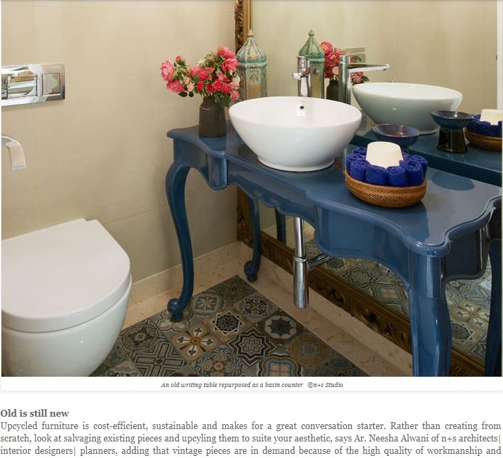 Old is still new: Upcycled furniture is cost-efficient, sustainable and makes for a great conversation starter. Rather than creating from scratch, look at salvaging existing pieces and upcyling them to suite your aesthetic, says Ar. Neesha Alwani of n+s architects| interior designers| planners, adding that vintage pieces are in demand because of the high quality of workmanship and materials used.